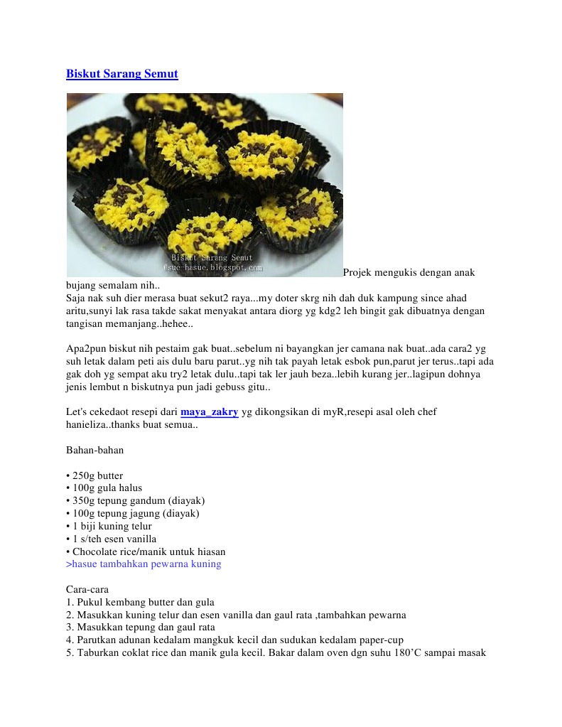 Biskut Sarang Semut from imgv2-2-f.scribdassets.com Biskut sarang semut adalah salah satu biskut raya tradisional yang menjadi kegemaran ramai sejak dari dulu sampai sekarang. Masukkan telur dan esen vanilla. Berikut adalah resepi kuih raya popular seperti almond london, tart nenas, cornflakes madu, brownies, sarang semut, biskut badam dan sebagainya. Cara membuat resepi biskut sarang semut: Tapi untuk memudahkan rujukan pada masa akan datang, naz sertakan sekali ukuran dalam unit gram. Resipi sedap dan mudah untuk biskut sarang semut. Biskut ni juga antara biskut wajib yang akan saya buat setiap tahun. Masukkan pewarna kuning , susu tepung dan tepung kastard.